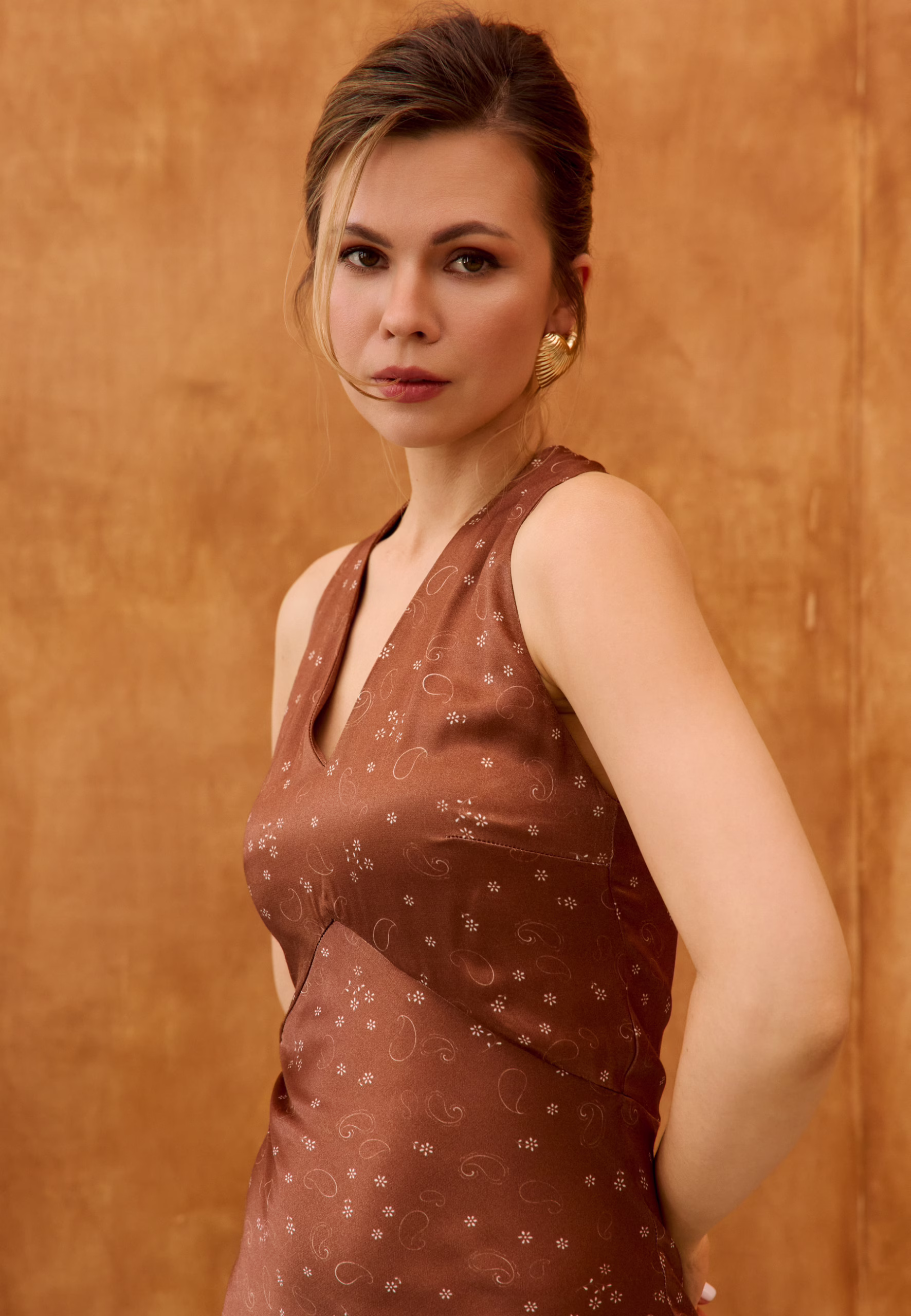 Dopasowana sukienka maxi na cienkich, regulowanych ramiączkach, która podkreśla sylwetkę i wydłuża linię ciała. Model zapinany na kryty zamek z tyłu, z subtelnym rozcięciem na nogę dla większego komfortu i lekkości.
