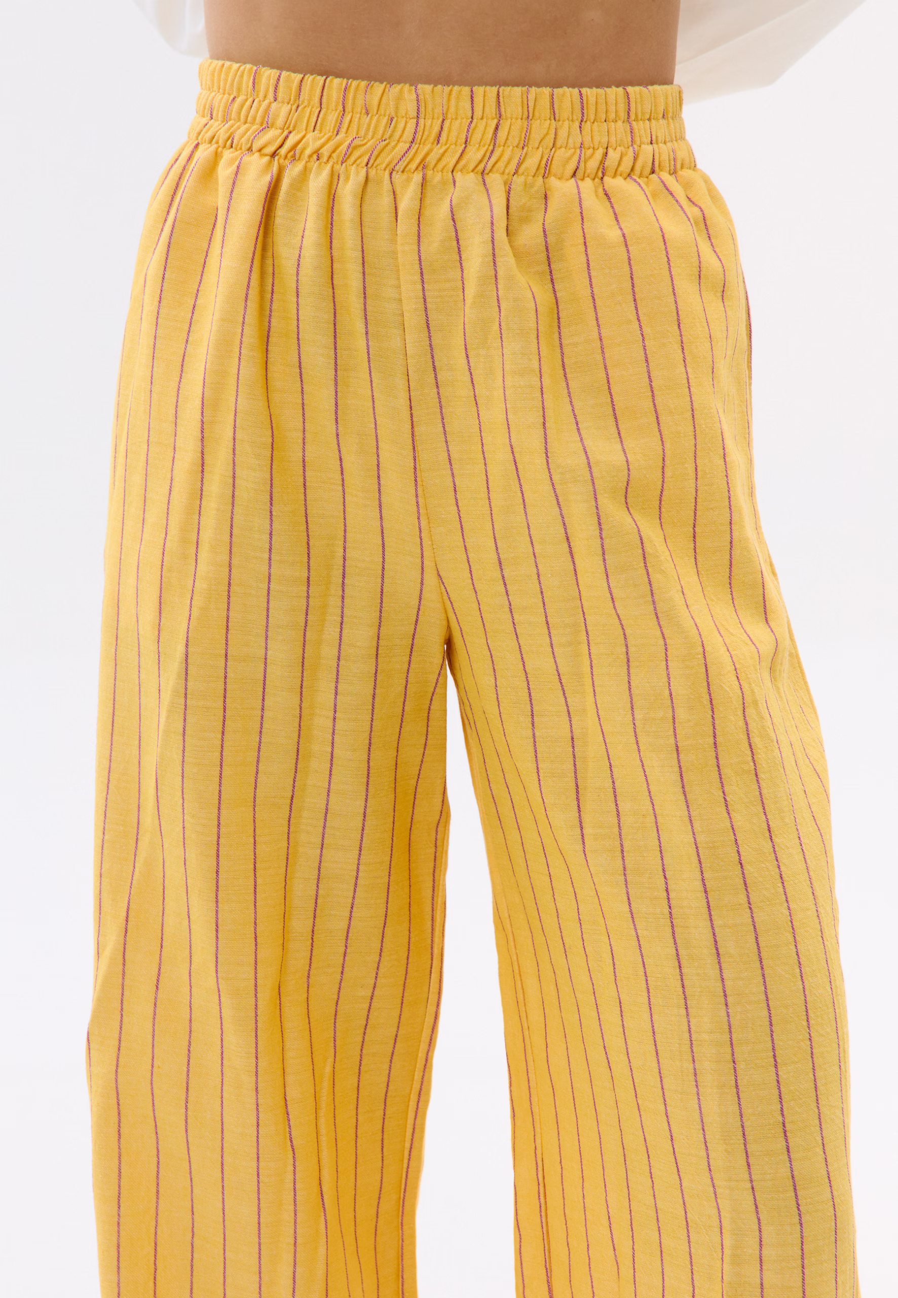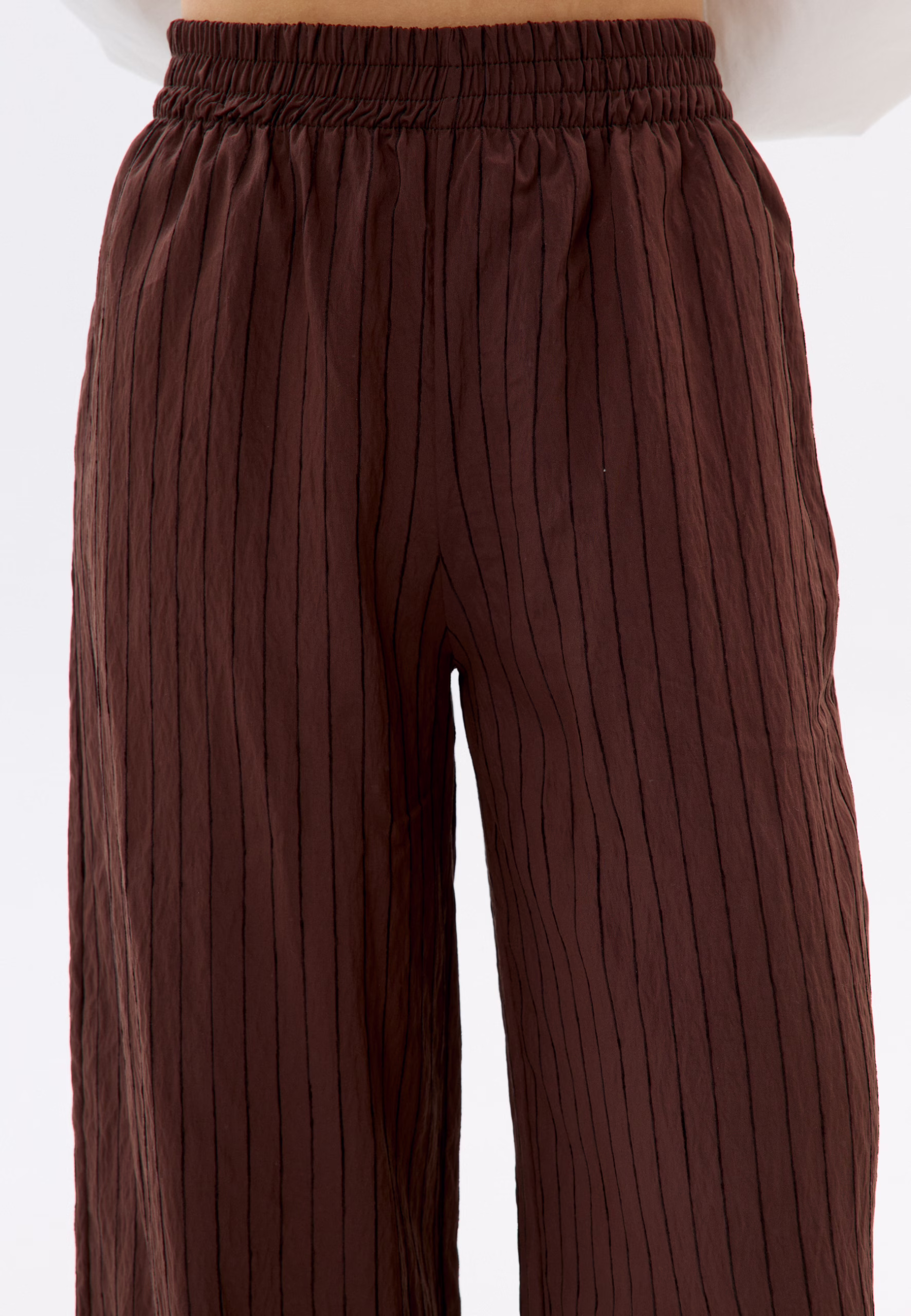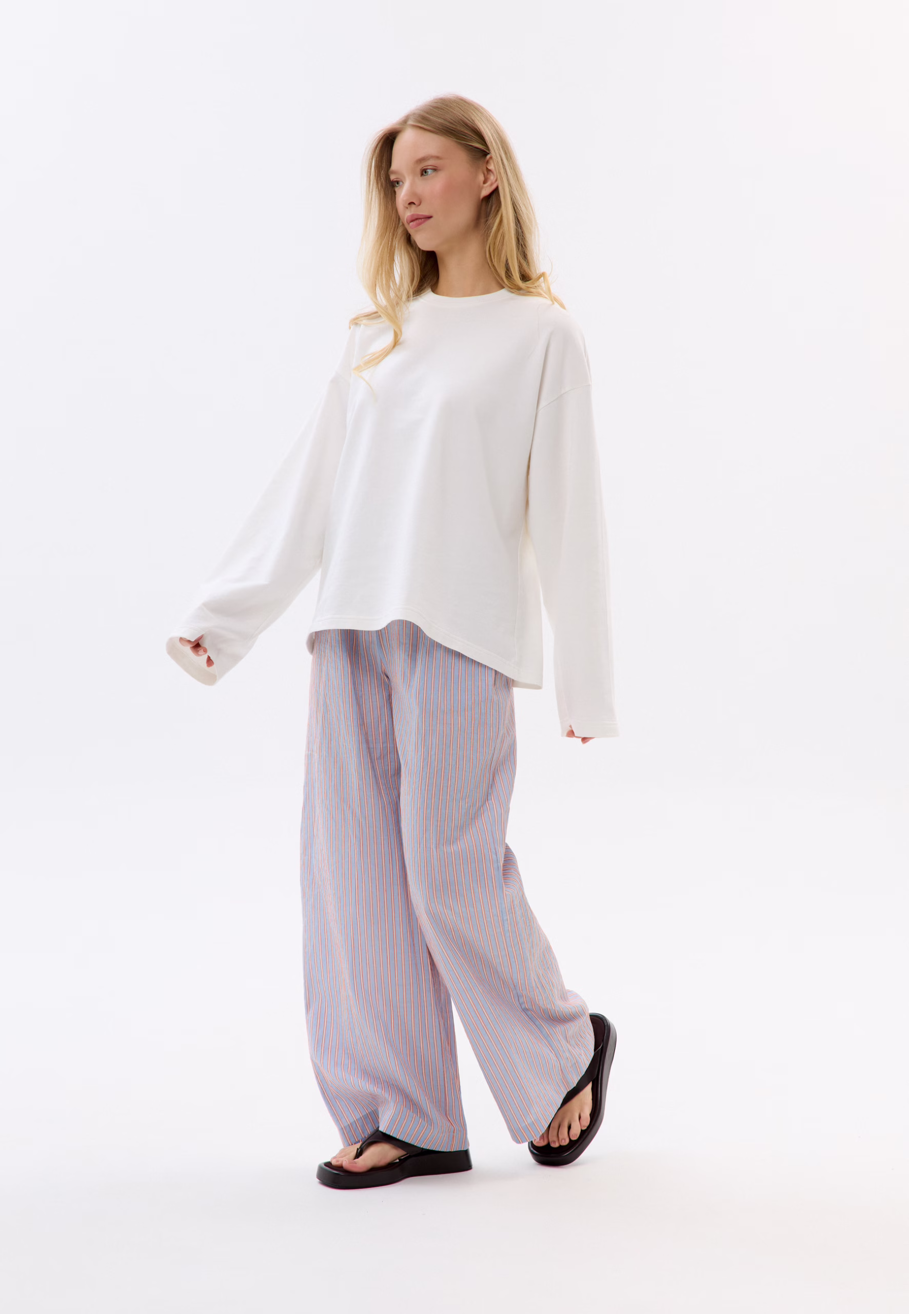 Niebieskie spodnie w paski uszyte z wyjątkowej bawełny to doskonały wybór na wiosenne i letnie stylizacje. Ich luźny krój, wysoki stan oraz elastyczna gumka w pasie zapewniają komfort noszenia, a praktyczne kieszenie dodają funkcjonalności. Zestaw je z koszulą, by stworzyć lekki, letni set na plażę, miasto lub spontaniczne spotkania z przyjaciółmi. Łącz je z ulubionymi adidasami lub klapkami, białym longsleevem lub koszulką Mirons, dodaj okulary i ciesz się stylowym lookiem na co dzień! Modelka ma 173 cm wzrostu, nosi rozmiar XS/S. Skład: Długość całkowita – 107 cm.